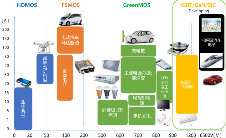 在微電子領(lǐng)域,碳化硅半導體的優(yōu)勢在1000V以上的中高電壓范圍。1200V以上的碳化硅應用領(lǐng)域有新能源汽車(chē),光伏,機車(chē)牽引,智能電網(wǎng)等,高鐵機車(chē)的牽引電壓在6500V以上,地鐵則一般在3300V左右。