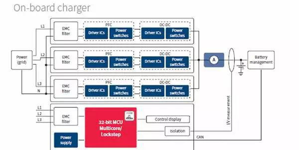 用于EV的充電裝置在工廠(chǎng)安裝,稱(chēng)為“車(chē)載充電器”(OBC)。在EV或插電式混合動(dòng)力EV(PHEV)中,OBC提供了在家中或從私人或公共充電站中的插座為AC電源充電的方法。OBC使用AC / DC轉換器將50/60赫茲(Hz)交流電壓(100至240伏)轉換為直流電壓,為高壓牽引電池充電(通常約為400伏直流電)。它還根據電池要求調整直流電平,提供電流隔離,并包括交流/直流功率因數校正(PFC)(圖3)。