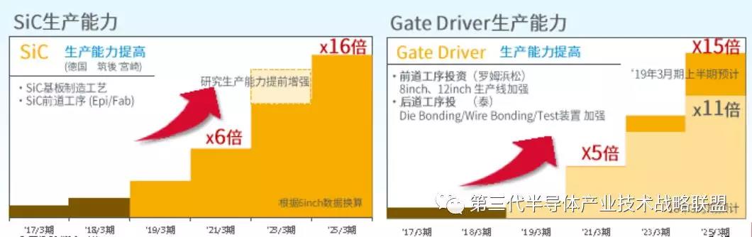 羅姆的SiC產(chǎn)能預計2021年會(huì )達到2017年的6倍,2025年的時(shí)候會(huì )達到2017年的16倍(如下圖左)。除了SiC之外,驅動(dòng)SiC還需要柵極驅動(dòng)器,羅姆的柵極驅動(dòng)的產(chǎn)能也會(huì )越來(lái)越提高(下圖右)。