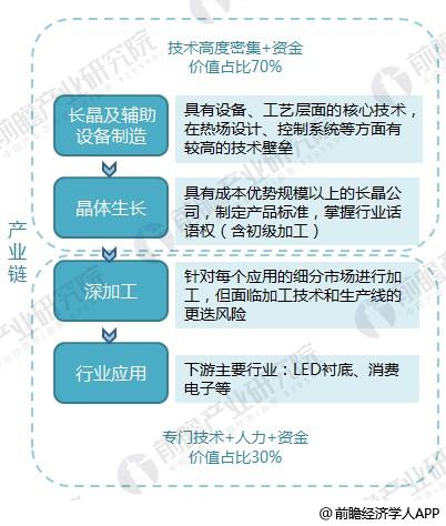 藍寶石產(chǎn)業(yè)鏈包括長(cháng)晶及輔助設備制造、晶體生長(cháng)、深加工和行業(yè)應用四部分。其中,長(cháng)晶及輔助設備制造和晶體生長(cháng)這兩個(gè)環(huán)節的價(jià)值占整條產(chǎn)業(yè)鏈的70%,需要高度密集的技術(shù)和資金。整條產(chǎn)業(yè)價(jià)值鏈如下圖所示。